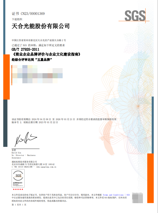 近日,天合光能顺利通过国际知名认证机构通标标准技术服务有限公司(以下简称“SGS”)的第三次监督审核,再次获得ISO 20671-1:2021“铂金级别”品牌认证和GB/T 27925-2011 “五星品牌”证书,成为业界首个蝉联品牌最高等级评价的企业。此次认证的标准体系ISO20671和GB/T 27925是国际标准化组织(ISO)和中国商业联合会发布的品牌管理体系标准,其认证不仅是企业品牌管理能力的权威背书,更是企业国际竞争力的重要佐证。该品牌认证通过第三方审核来验证品牌管理的规范性与有效性,帮助提升消费者与合作伙伴对品牌的信任感。